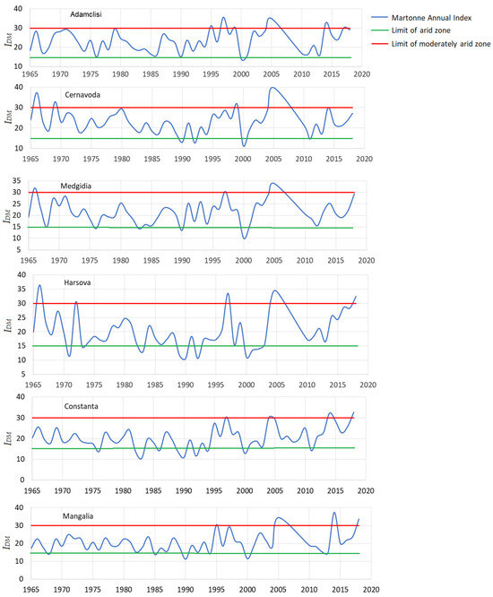 Considering the classification presented in the Materials and Methods section, we found that the drought hazard is very high at Cernavodă, Hârșova, and Mangalia. It is reduced at Adamclisi, moderate at Constanța, and high at Medgidia. The results are in concordance with those of the de Martonne aridity index, which indicates the highest extremes (over 35) at Cernavodă, Hârșova, and Mangalia and abrupt variations in time.