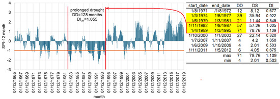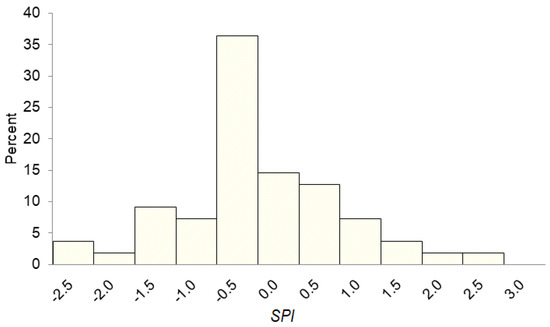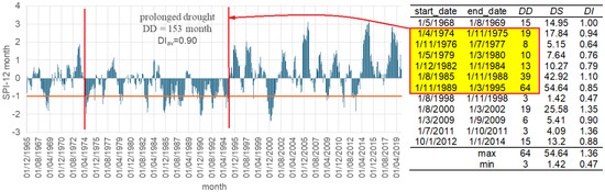 The SPI computation allows one to determine the duration (DD), severity (DS), and intensity (DI) of drought. DD represents the number of months between the drought’s start and its end. DS is the sum of the absolute values of the SPI during the period of drought. DI is obtained by dividing DS by DD [59].