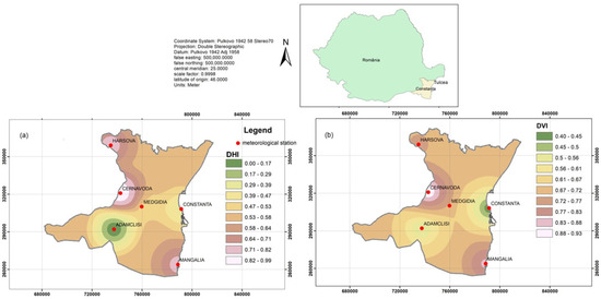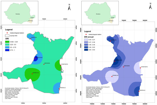 Figure 7 (left) shows the DRI map built using the SPI computed at 3-months. It indicates the highest risk to drought at Cernavodă and the lowest at Constanța and Adamclisi. The DRI varied between 0.25 and 0.5, which means a medium risk in the rest of the territory. The results are concordant with the actual situation, given the water resources (surface and groundwater) from which both cities benefit.