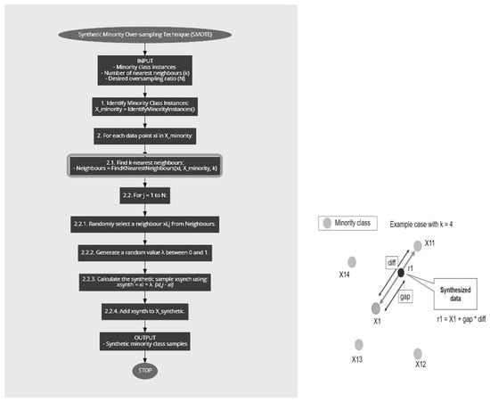 Here, in Equation (2), is a random value that varies between 0 and 1, introducing controlled randomness in the interpolation process. The desired oversampling ratio determines the number of synthetic samples created. Figure 2 shows the flowchart of generating a sample using the SMOTE technique with an illustrative example for k = 4.
