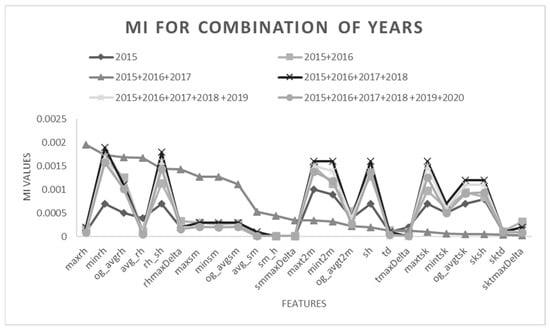 The MI values are calculated for each of the 24 variables and the fire flag matrix. Since the meteorological parameters are continuous, they are binned against their minimum and maximum values with a user-specified number of bins. This allows us to calculate the joint and individual probabilities based on the frequency of occurrence of the respective values in a particular bin. Based on a trial-and-error approach, we found that a number of bins equal to 35 consistently provided greater values for nearly all parameters. So, we fixed the bins to 35 while calculating the individual and joint probabilities of various input parameters. The mutual information between each variable and the fire flag matrix for different combinations of years’ data is shown in Figure 3.
