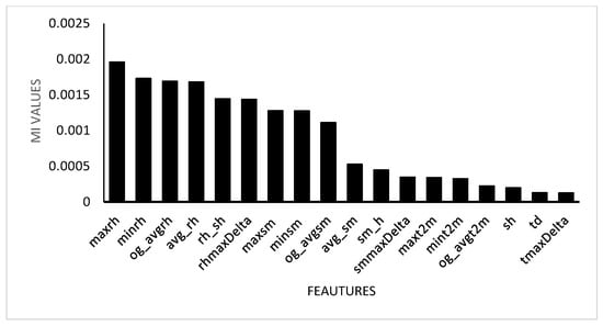 The resulting MI values for each input variable listed in Table 1 against the discrete fire flag matrix are stored and compared. The MI values obtained using Equation (1) provide valuable information on the predictive capabilities of these continuous variables, assisting in selecting features for the development of models or early warning systems for wildfire prediction.