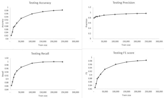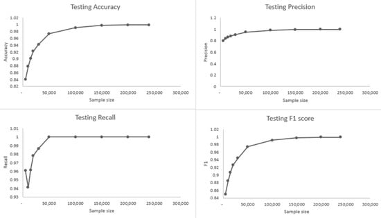 Interesting insights are obtained by comparing the performance of the weighted sampling and SMOTE techniques in random forest (RF) models with different training sample sizes. With data sampling, the average accuracy, precision, recall, and F1 score consistently increase from 5000 to 240,000 training samples. The robustness and capacity to generalise effectively with bigger training volumes of the model are demonstrated by its superior performance across every factor. On the other hand, using SMOTE, the performance improves initially as the training sample size grows, but after a while, the performance saturates. The model shows good accuracy, precision, recall, and F1 score results; however, there is not as much improvement as with data sampling.