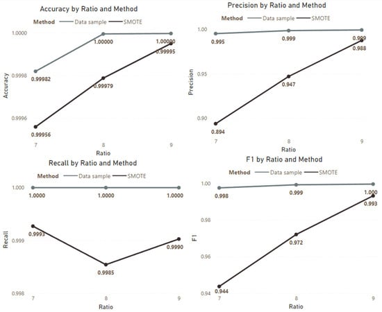 From both Figure 5 and Figure 6, we observe that the performance of the random forest classifier depends on how we handle the imbalance of classes. Distinct trends are shown when comparing the two methods, which show how well the SMOTE and data sampling approaches handle class imbalance in random forest (RF) models. With data sampling, the average accuracy and precision consistently increase as the imbalance ratio increases from 1:1 to 1:15. The model effectively categorises the event as fire or no fire, even with imbalance. When the ratio imbalance rises, so does the SMOTE performance. The recall and F1 scores decrease significantly when the ratio exceeds 6. This implies that although SMOTE improves the model’s classification performance at the beginning, as the imbalance ratio rises, it is difficult to compromise recall and precision. Recall is a trade-off, though; it worsens as the ratio increases. This implies that even if the model improves at accurately categorising members of the majority class, it can have trouble identifying the members of the minority class.