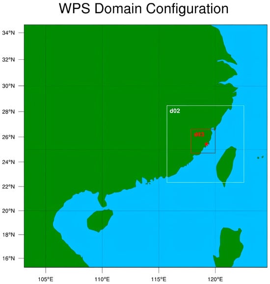 In this study, the WRF model was designed to have three one-way interactive nested domains, and their center was at 25.3° N, 113.8° E with a Mercator projection. The horizontal resolutions for domains d01, d02, and d03 were 9 km (241 × 241 grid points), 3 km (229 × 229 grid points), and 1 km (214 × 214 grid points), respectively. The model was set to run on 32 vertical atmospheric layers with a pressure top of 50 hPa. The extracted time was between midnight 00 UTC on 17 August 2018 and midnight 00 UTC on 21 August 2018. The extracted meteorological parameters included the wind direction, wind speed, atmospheric temperature, atmospheric pressure, relative humidity, geopotential height, sea-level pressure, soil water content, soil temperature, land coverage types, etc. Their spatial resolutions were 0.25° × 0.25°. The simulation domain is shown in Figure 1.