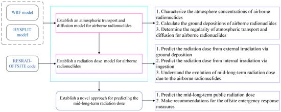 Therefore, the original motivation of this research is to propose a novel approach for predicting mid–long-term radiation doses. To achieve this objective, our research aims to (1) use an atmospheric transport and diffusion model for airborne radionuclides in the hypothetical STSBO scenario by coupling the WRF and HYSPLIT models to form the WRF-HYSPLIT model and determine the regularity of the atmospheric transport and diffusion of airborne radionuclides; (2) establish a radiation dose model using the Residual Radioactive Material Guidelines (RESRAD) OFFSITE (RESRAD-OFFSITE) code to predict the mid–long-term radiation doses resulting from airborne radionuclides and understand the evolution of these doses; and (3) propose and apply a novel approach for predicting mid–long-term radiation doses in an ONPP, providing recommendations for offsite emergency response measures.