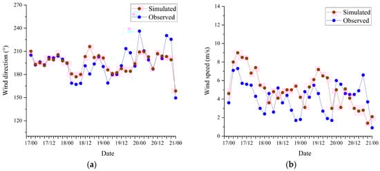In order to validate the accuracy of the WRF model at FFNPCL, the wind direction and wind speed data simulated by the WRF model were compared with the observed data from the meteorological station at FFNPCL. The results are shown in Figure 3.