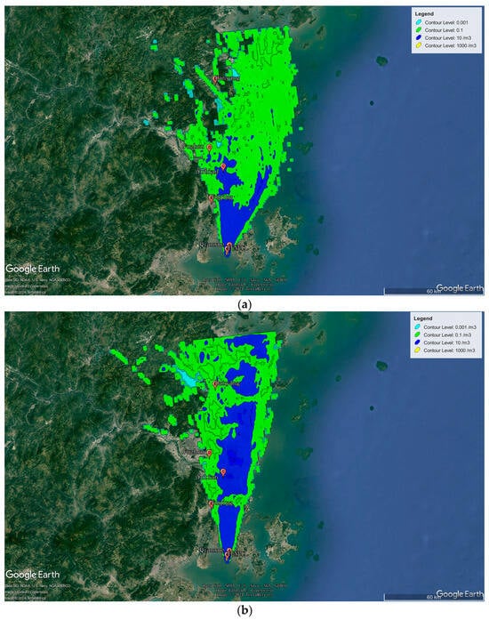 Through the above analysis, the regularity of the atmospheric transport and diffusion for airborne radionuclides from a nuclear accident for the ONPP, we clarified that the meteorological parameters, shown in Section 2.1, in the simulation domain and the modified radioactive source terms, described in Section 2.3, would affect the process of atmospheric diffusion for airborne radionuclides.