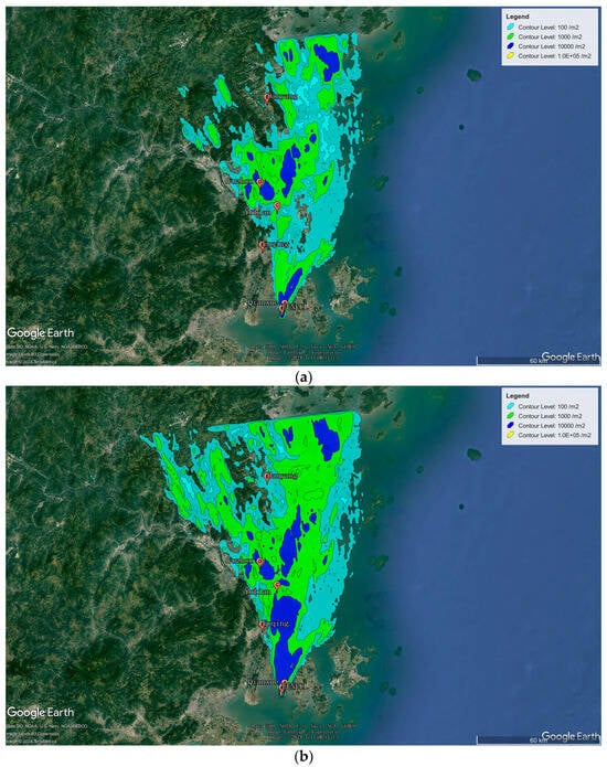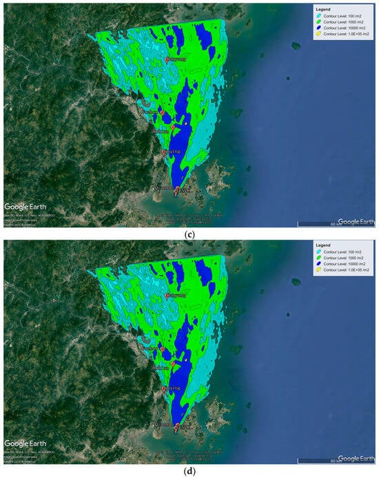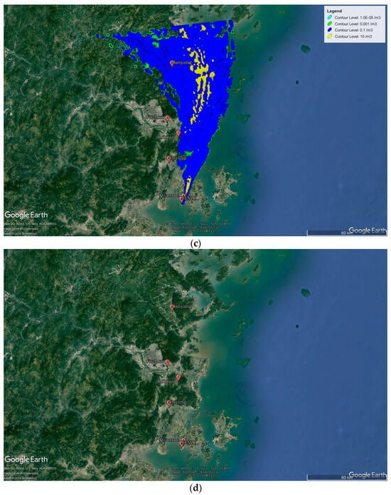 As shown in Table 1, some radionuclides, which include 131I, 123I, 133I, 135Xe, etc., have a very short half-life. However, the most representative radionuclide, 137Cs, has a high release amount, a high toxicity, and a long half-life. Therefore, the WRF-HYSPLIT model was used to calculate the atmospheric concentrations of 137Cs at the 12th h, 24th h, 36th h, and 48th h after the hypothetical STSBO nuclear accident for the ONPP in FFNPCL, as shown in Figure 4a, Figure 4b, Figure 4c, and Figure 4d, respectively. The corresponding ground deposition is shown in Figure 5a, Figure 5b, Figure 5c, and Figure 5d, respectively, in the simulation domain.