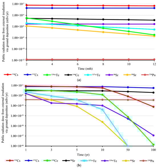 Figure 6a shows that the radiation dose from 134Cs through external irradiation via ground deposition would be the highest among those from all radionuclides in the 2–12 months after the hypothetical STSBO nuclear accident for the ONPP in FFNPCL, that from 137Cs would be the second highest, and that from 238Pu would be the third highest. The radiation doses from all the radionuclides would decrease over time, and the degrees of decrease from 129mTe, 127mTe, and 89Sr would be significantly larger than those from the other five radionuclides.