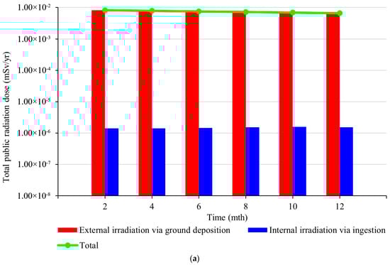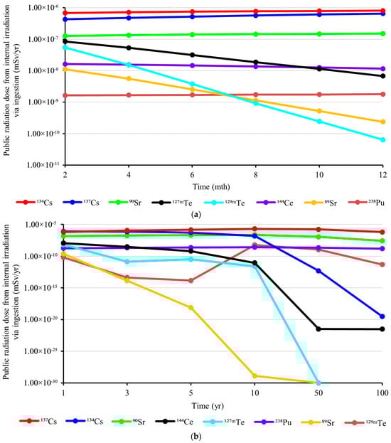 Figure 7a shows that the radiation dose from 134Cs through internal irradiation via ingestion would be the highest among those from all the radionuclides in the 2–12 months after the hypothetical STSBO nuclear accident. The radiation doses from 127mTe, 129mTe, and 89Sr would decrease over time, and their degree of decrease would be in the order of 129mTe ˃ 89Sr ˃ 127mTe. The radiation doses from the other five radionuclides would increase slowly over time.