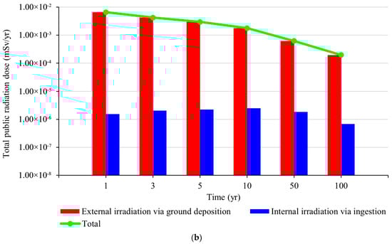 As shown in Figure 8, the total radiation dose would be smaller than the dose limit recommended by International Commission on Radiological Protection (1 mSv/yr) from the second month to the 100th year after the hypothetical STSBO nuclear accident. The total radiation dose would decrease slowly over time. The radiation dose from external irradiation via ground deposition would be significantly higher than that from internal irradiation via ingestion, indicating that the radionuclides would mainly affect the public through external irradiation.