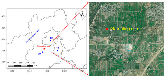 Location of the sampling site in North China Plain. The BJ, TJ and BD represent the cities of Beijing, Tianjin and Baoding, respectively.