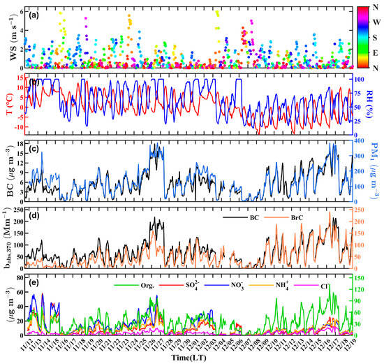 The temporal variations of the meteorological parameters, PM1 and BC mass concentration, the BrC light absorption and PM1 chemical composition are shown in Figure 2. Overall, the average T, RH and WS during the campaign are 0.6 ± 6.0 °C, 63.0 ± 25.5%, and 0.9 ± 1.1 m/s, respectively. The average mass concentrations of BC and PM1 are 5.8 ± 3.9 and 135.1 ± 82.3 μg/m3, respectively. The mass fraction of BC in PM1 is about 4.4 ± 1.4%, which is consistent with other studies in the NCP [36,39]. These indicate that the mass concentrations of PM1 in this region are high and exhibit significant variability. Sun et al. (2021) [47] reported an average PM2.5 mass concentration of 63.0 μg/m3 from December 2019 to January 2020 in the same sampling site. Liu et al. (2021) [45] also showed that the PM2.5 mass concentration in the same site ranged from 39.8 to 396.8 μg/m3 in November 2016. It is also within the range (65–200 μg/m3) observed in the urban regions [38,39], indicating that the rural region is also severely polluted in winter, which is consistent with our results. Further, we can see that organics constituted a major fraction of PM1 (Figure 2e), similar to other studies [47], with an average of 35.6 ± 23.4 μg/m3, followed by nitrate (11.9 ± 11.3 μg/m3), sulfate (8.6 ± 9.1 μg/m3), ammonium (9.1 ± 7.0 μg/m3) and chloride (3.0 ± 2.6 μg/m3). This indicates that the secondary inorganic aerosol is dominated by nitrate, which is also supported by previous studies [38,46].