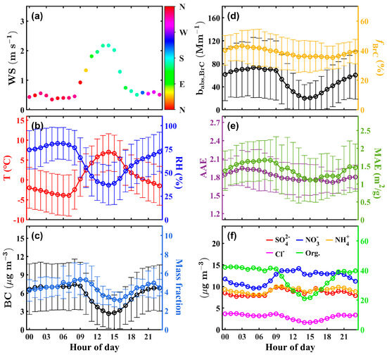 Diurnal trends of BrC-related parameters. (a) The wind speed (WS) and wind direction (WD); (b) the temperature (T) and relative humidity (RH); (c) the BC and its mass fraction for PM1; (d) the light absorption of BrC at 370 nm and its fraction of total absorption (fBrC); (e) the AAE of all light absorption and the MAE of BrC at 370 nm; (f) the mass concentrations of non-refractory components, including organics, SO42−, NO3−, NH4+ and Cl−. The lines show the average value at each hour and error bars denote ±1σ.