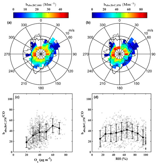 (a,b) Bivariate polar plots for hourly light absorption of BC at 880 nm and BrC at 370 nm, the black dashed and solid line represent the average light absorption in different WD and the frequency of occurrence of different WD, respectively; (c,d) the ratio of light absorption of BrC to CO at 370 nm evolution against Ox and RH, respectively.