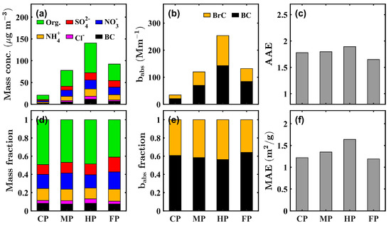 The mass concentrations of different chemical compositions are shown in Figure 5a,d. Throughout the observation periods, PM1 is primarily composed of organics, followed by nitrates. In the CP, the concentration of each component is the lowest, and the mass fractions of different components are similar to those in the MP. Compared to the CP, the mass concentrations of all components increase during MP and HP. Moreover, for HP, the significant increase in BC and Cl− implies an increase in primary emission sources, such as the contribution of biomass and coal combustion. Previous studies have shown that coal combustion and biomass combustion contribute more to BrC primary sources in rural sites of the NCP than traffic sources [39,47]. Therefore, reducing biomass and coal combustion may effectively reduce BrC emissions and the frequency of high pollution events in rural regions of the NCP. Additionally, in the FP, the mass concentrations of OA, Cl− and BC are basically unchanged compared with MP, while the secondary components of SO42−, NO3− and NH4+ increase. The mass fractions of SO42− and NO3− also increase significantly during the FP, which are mainly because the aqueous phase reaction promotes the generation of secondary inorganic components [54,64]. The light absorption of BrC at different periods is lower than that of BC (Figure 5b). The light absorption of OA at different periods is lower than that of BC. Consistent with the changes in chemical component concentration, the light absorption of BC and BrC increases significantly from a clean to a high pollution period. And the light absorption of FP is comparable to that of the MP, reflecting the changes in chemical component concentrations. The light absorption fraction of BrC in the HP increases significantly, with the AAE and MAE reaching their highest values. Primary emissions are more prevalent during this period, contributing to a higher absorption capacity. During the FP, aqueous reactions at a high RH may lead to the bleaching of BrC, resulting in a general reduction in light absorption, as well as AAE and MAE.