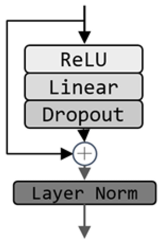 Throughout the model architecture, residual connection blocks are frequently employed (as shown in Figure 1). Each residual block is composed of a Multi-Layer Perceptron (MLP) with a hidden layer and employs ReLU activation functions to introduce non-linearity, thereby enhancing the model’s capacity to capture complex features. A critical aspect of each residual block is its skip connection, which directly maps the input to the output, allowing gradients to flow uninterrupted through the network. This feature significantly improves the training efficiency of deep networks. Both the dropout and the layer norm can be turned on or off by a model level hyperparameter [29].
