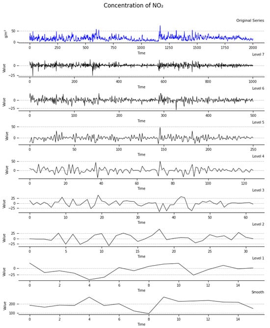 For the input pollutant raw data , it is initially decomposed via the MODWT to capture more explicit information about the observed time series. ethm will provide us with J higher-frequency detail coefficients and a smooth (trend component) of the available time series. In Figure 2, we present a visual representation of the MODWT decomposition applied to the NO2 concentration series in atmospheric pollution data, utilizing a Haar filter. The MODWT decomposition can be represented as:
