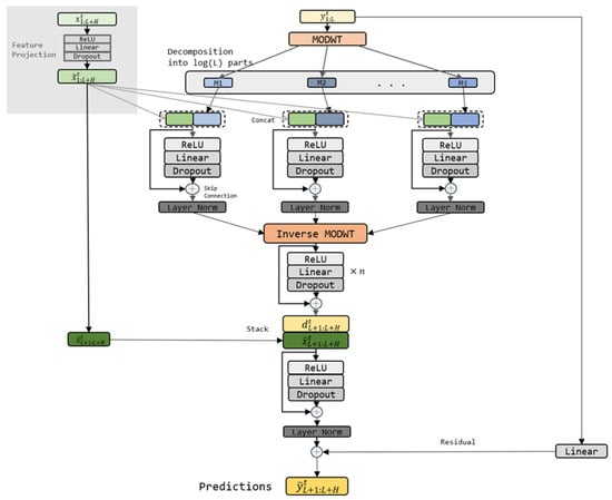 Next, we perform an inverse wavelet transform on and to obtain one-dimensional vectors of length h. These vectors are then passed through n residual blocks to generate a one-dimensional prediction component of length , where H represents the output sequence length, p denotes the output dimension, and n is the number of residual blocks, a hyperparameter.
