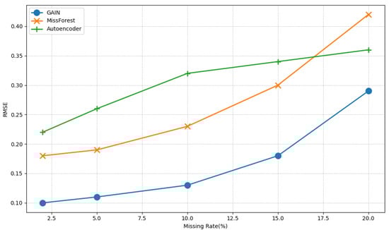 RMSE performance in various missing rates.