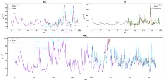 Furthermore, we have applied our trained models to real-world data to evaluate and compare their predictive capabilities, with the comparative curves illustrated in the Figure 5. Our findings indicate that initially, the LSTM model’s forecasting accuracy is competitive with those based on Transformer architectures. Nonetheless, with an extended forecast sequence, there is a gradual increase in cumulative errors, which diminishes its predictive accuracy. The DLinear model also shows superiority over Transformer-based models for shorter forecast sequences but faces challenges in capturing the complex dynamics between pollutants as the forecasting horizon grows. Even so, it retains a level of performance that is still respectable. The WTMP model, enhancing the foundation laid by DLinear, demonstrates the most impressive practical performance, thanks to the MODWT decomposition that adeptly manages non-stationary data characteristics. By sidestepping the complexity of the self-attention mechanism, the MLP within the WTMP model excels particularly in long-term forecasting tasks. The experimental outcomes underscore its markedly superior forecasting performance in comparison to other models.