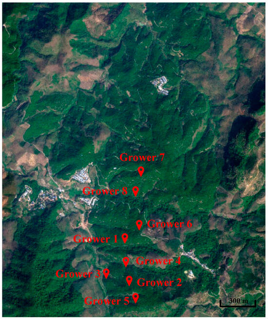 The trial sites were selected from areas with a planting history of more than 20 years. The eight trial sites were located in Bana Village, Jingha Township, Jinghong City, and Yunnan Province, China (100°59′16″ E, 21°48′37″ N), at a distance of approximately 3 km from each other (Figure 1). Jingha Township is situated within the tropical rainforest climate zone, which is characterized by sustained high temperatures and precipitation levels throughout the year. The test site was located in a mountainous region in close proximity to Jingha Township at an altitude of 890–950 m. Notable variations in temperature and precipitation were observed between years, which were attributed to climate change. It was observed that the macadamia nut trees at all trial sites were in a period of stable production.