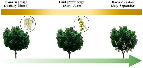 Because of the existence of anti-seasonal flowering and batch flowering in macadamia nuts, which can easily lead to inconsistencies in fruit development and maturity, the present study used the approximate period to indicate concentrated fruit development. According to a study by Dong Qianqian et al. [] and the macadamia development observed in the experimental site, the growth and development stages of macadamia nuts were roughly divided into the flowering stage (January–March), the fruit growth stage (April–June), and the harvesting stage (July–September), as shown in Figure 2.