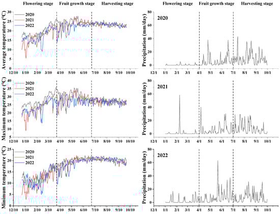 Temperature and precipitation trends at the flowering, fruit growth, and harvesting stages of macadamia nuts from 2020 to 2022. Note: The dotted lines in the figure are used to distinguish the different growth stages of macadamia nuts.