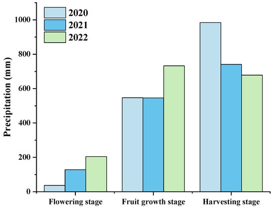 Differences in precipitation at the flowering, fruit growth, and harvesting stages of macadamia nuts from 2020 to 2022.
