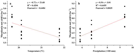 Linear fit of temperature and macadamia nut yield (a) and linear fit of precipitation and macadamia nut yield (b). The temperature represents the average temperature during the flowering to fruit growth stage, whereas the precipitation represents the sum of the precipitation during the flowering to fruit growth stage.