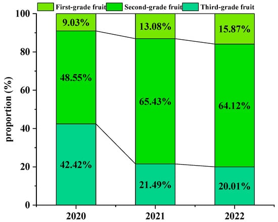 The proportions of first-grade, second-grade, and third-grade fruit from 2020 to 2022.