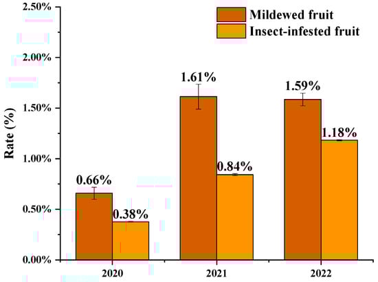 The rates of mildewed and insect-infested fruit from 2020 to 2022.