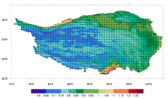 Spatial distribution of actual air density (kg·m−3) over TP. (The black dots represent the grid boxes with a resolution of 0.5° × 0.5°).