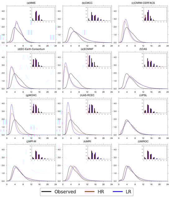 Figure 2 presents the climatic means of the observed and simulated (by both LR and HR) probability distributions of the wind speed at 100 m over the TP provided by 22 models from 11 institutes as well as their MME. For the observations, the maximum wind speed over the TP was 19.35 m·s−1, and the probability distribution exhibited considerable skewness with a long tail toward the right-hand side. The wind speed value of 3.8 m/s was the peak probability of the observed wind speed, followed by the median (5.0 m·s−1), and the mean (5.4 m·s−1) had the lowest probability of the three measures. The cumulative probabilities of the observed wind speeds range from 12.96% for speeds of 0–3 m·s−1 to 6.54% for speeds of 9–12 m·s−1, with the breakdown as follows: 0–3 m·s−1 (12.96%), 3–6 m·s−1 (51.41%), 6–9 m·s−1 (28.32%), and 9–12 m·s−1 (6.54%). This distribution indicates that most of the observed wind speeds over the TP were less than 12 m·s−1.