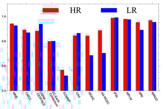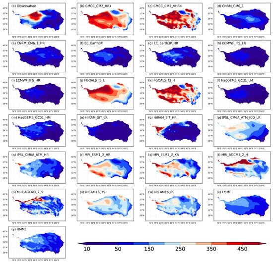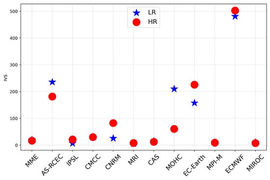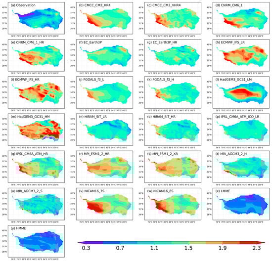 The IVS can serve as a quantitative statistical index to evaluate a model’s skill in simulating interannual variability at each grid box and the closer the IVS value is to zero, the better the capability of simulating interannual variation. To further quantify the performance of GCMs in simulating the interannual variation in WPD over the TP, the IVS for each model was then calculated via Equation (7) (Figure 9). The figure shows the IVSs of the HR (LR) simulations ranged from 7.92 to 502.52 (5.49 to 480.96), with the maximum and minimum IVS values obtained from ECMWF and MRI, respectively. In the simulation of interannual variability of WPD, models institutions such as IPSL, CMCC, MRI, CAS, MPI-M, and MIROC demonstrated superior performance. The IVS values of these models were all lower than five, indicating their robust capability to capture the interannual changes in WPD over the TP. Conversely, AS-RCEC, CNRM, MOHC, EC-Earth, and ECMWF showed relatively higher IVS values, indicating they were less effective at capturing the interannual variability of WPD over the TP. The ensemble means results for both HR and LR provided better representations of the interannual variability characteristics of WPD, with IVS values of 3.58 and 4.44, respectively. The lower IVS observed in the HMME compared with the LMME suggests that enhancing the spatial resolution of climate models substantially improves their ability to capture the interannual variability in WPD over the TP. HR models offer a more detailed representation of complex terrain and atmospheric processes, which are crucial in regions such as TP with intricate topographies and meteorological patterns. According to Haarsma et al. [26], increasing the model resolution can lead to better simulations of atmospheric dynamics and improved climate variability representation. Therefore, utilizing HR models contributes to more accurate and reliable simulations of WPD’s interannual changes over the TP.