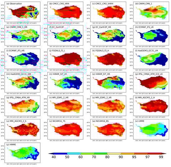 (a) Observed and (b–y) simulated (both LR and HR) spatial distributions of EWH (%) at 100 m over the TP provided by 22 models from 11 institutes.