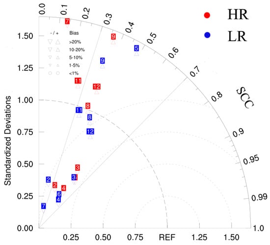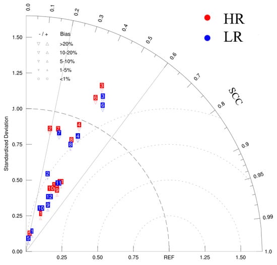 Taylor diagram of HR- and LR- simulated EWH over the TP. The angular axes indicate the SCC between the simulations and observations, whereas the radial axes display the normalized spatial standard deviation (SSTD) relative to the observations. The dashed arc represents the CRMSE. The red and blue colors represent the HR and LR simulations, respectively. The numbers 1–11 represent different models (see Table 1), and the number 12 represents the MME. The symbols in the upper left panel denote the relative bias, and “REF” is the reference, representing the observed EWH.