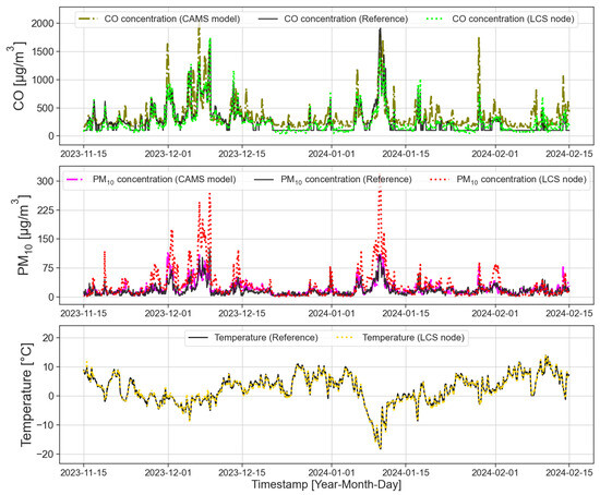 The overall quality of the LCS node data and the qualitative indicators of the CAMS model compared to the reference measurements are also illustrated by the plots shown in Figure 6. The average reference CO concentration over the evaluation period shows the same trend of diurnal variation as .