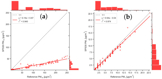 Vogt et al. [23] also confirm that the SPS30 sensor is mostly accurate and reliable for particles with . For particles, the value was around 0.73. The results for particles indicate a higher value () compared to the results of Kuula et al. [22], yet the sensor is still not suitable for practical AQM applications.