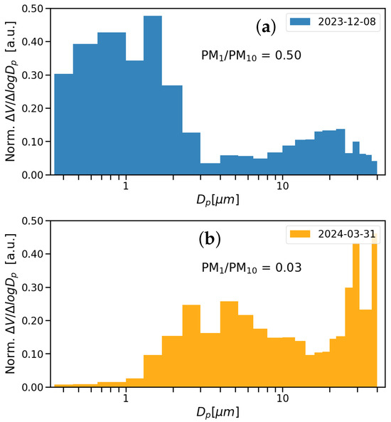 Considering these findings together with the results of our LCS node measurements against the reference data, we can conclude that the SPS30 provides a reliable response to fine dust particles, especially , even under Saharan dust storm conditions. The readings from the SPS30 sensor according to its original calibration (i.e., factory setting) are burdened with a systematic bias, whose trend (negative or positive) depends on the type of smog situation. Therefore, to conclude this discussion, let us take a closer look at the size-resolved histogram of the PM volume concentration distribution obtained from the OPC-N3 sensor on days with maximum concentration in the case of S1 and S2 episodes (see Figure 12). The difference in particle size resolution is noticeable, with both data showing significant bimodality. In the case of the Polish smog (S1), the total volume is clearly dominated by . On the other hand, in the case of the Saharan dust storm (S2), particles with aerodynamic diameter have the highest volume concentration from the total found in the size-resolved distribution.