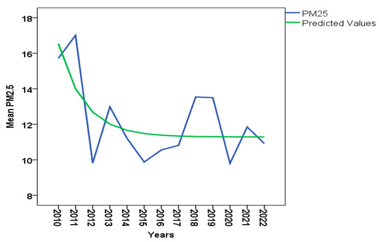 The mean PM2.5 trend in Kaunas ambient air for 2010–2022 (R2 = 0.449).