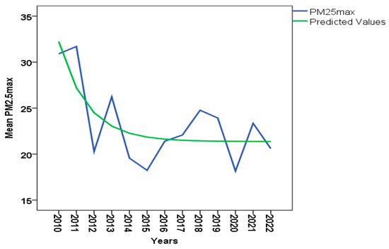 The mean PM2.5 max. trend in Kaunas ambient air for 2010–2022 (R2 = 0.546).