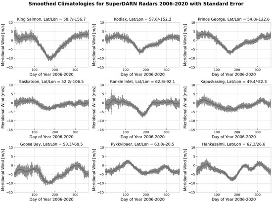 Radar station climatology data. Smoothed yearly climatology of meridional winds at each of the 9 stations from the years 2006–2020, along with the standard errors (grey brackets).