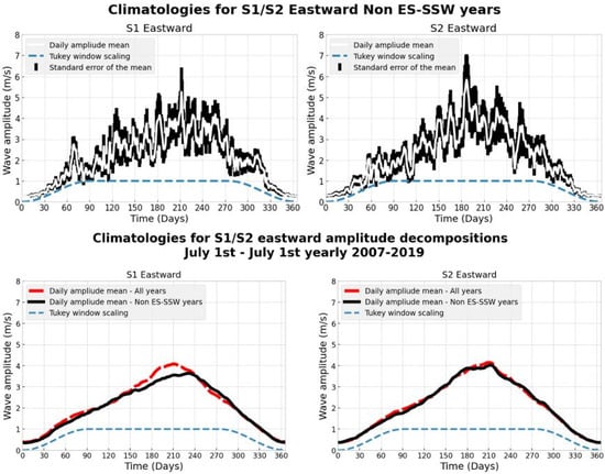 The climatological amplitudes of the EPW-S1 and -S2 were calculated for the 8 years between 2007 and 2019 (Figure 2, top panel), after the removal of the 5 years that featured ES-SSW events during winter (see Section 2). The same climatological data are shown after smoothing using a 61-day boxcar average, as described in Section 2 (Figure 2, bottom panel). From the latter, it is apparent that both the EPW-S1 and -S2 waves gradually built up in amplitude during the winter and reached their maxima in February (3.5 ms−1 around day 230) for S1 and in late January–early February (4 ms−1 around day 210) for S2, before gradually weakening. The red dashed lines show the smoothed climatological data when including all the years. Hence, it appears that the average seasonal evolution was fairly similar in both set of years, except that the wave amplitude for EPW-S1 was slightly higher in January, when the majority of the ES-SSW events during the period investigated occurred (Table 1). This is further examined in the next section. From these climatological, annually varying amplitudes, the EPWs appear to be much more ubiquitous at 95 km than previously assumed, and certainly not strictly limited to periods prior to ES-SSWs. These radar-based observations of meridional winds confirm earlier findings [2] on the ubiquity of EPWs based on re-analyses and MLS satellite observations, albeit here near 95 km (Section 2), i.e., at the upper edge of the layers sampled by MLS.