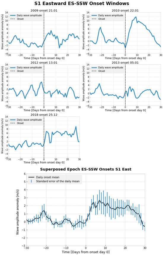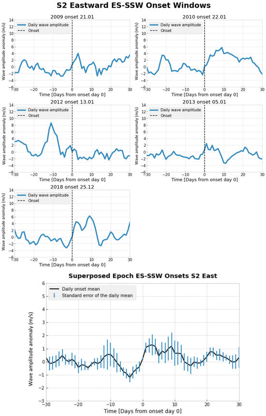 The behaviors of EPW-S1 and -S2 were also examined for years when an ES-SSW happened in the winter. The wave anomalies are presented in Figure 3 and Figure 4 for S1 and S2, respectively, over a 2-month period around each event during individual years and as the average obtained from the SEA (see Section 2). Most of the individual yearly anomalies and the averaged anomalies of EPW-S1 and -S2 show increased peaking within 10 days after the onset (up to 2.5 ms−1 for S1, and up to 1.5 ms−1 for S2 in the SEA). In the pre-onset period, there were also enhancements: the averaged EPW amplitude anomalies display increases of up to 1.5 ms−1 for S1, peaking 22 days before the onset, and of 0.5 ms−1 for S2, peaking about 10 days before the onset. The latter increase in EPW-S2 was not significant, as the SEM only encompasses the zero-amplitude line. However, there was a weak but significant decrease in EPW-S2 in the ten days prior to the onset, which could be indicative of an EPW-S2 critical line descending along with the westward wind layer and blocking it from reaching 95 km. Despite the predominance of the onset dates occurring in the month of January (Table 1), i.e., prior to the EPWs’ climatological seasonal maximum (Figure 2), these rapid enhancements post-onset or pre-onset were faster than the gradual seasonal build-up and may indicate that EPWs are generated from the instability of a disturbed polar vortex.