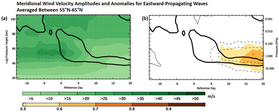 The composited meridional velocity amplitudes and their anomalies in Figure 5a,b showed a slight enhancement of EPW activity in the mesosphere around the onset. At ~95 km, the weak enhancement (up to 5 ms−1 at its peak near day 1) was seen from about 5 days prior to 7 days after onset. Figure 5b shows that, near 95 km, these enhanced amplitudes were not significant, with a probability of less than 0.5 of an amplitude being abnormal. The critical line for EPWs descended alongside the zero-wind line during the ES-SSW onset. This inhibited troposphere-sourced EPWs from propagating into the upper atmosphere after the onset. Figure 5a,b shows a decrease in the EPW amplitude and a significant negative anomaly following the onset.