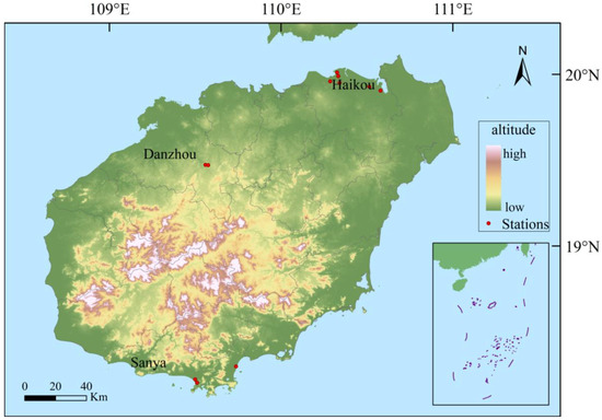 Surrounded by the sea, Hainan Island is situated in the southernmost section of China. The island is situated on the northern edge of the tropics and experiences a tropical monsoon climate that is warm and humid with abundant rainfall [19]. Its unique geographical environment and climate characteristics affect the spatial and temporal distribution of air pollution, so the atmosphere in the island area not only has the characteristics of an ocean but is also influenced by a land source. Coastal cities, such as Sanya and Haikou, generally exhibit lower levels of gaseous pollutants and particulate matter due to their stronger turbulence and lower anthropogenic emissions [3]. Hainan had 10.27 million permanent residents with a GDP of CNY 681.82 billion at the end of 2022. With a beautiful environment, high vegetation coverage, and rich biodiversity, Hainan is a well-known tourist region and received a total of 60.4 million tourists in 2022 [21].