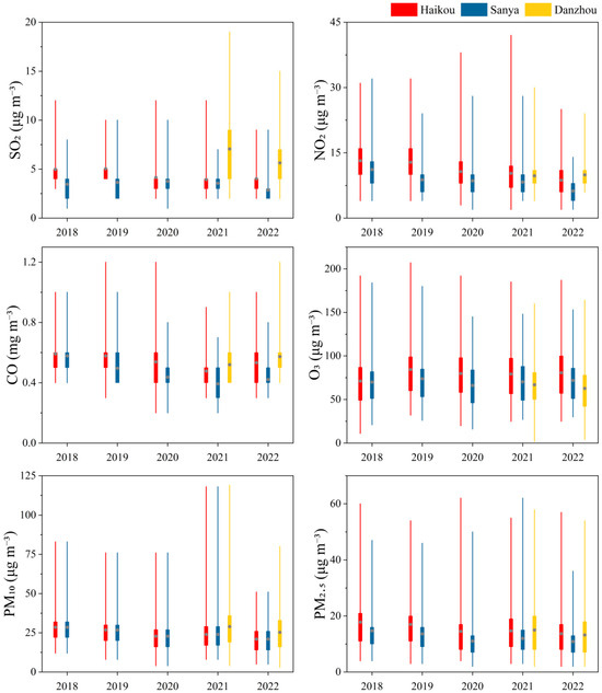 The mean concentrations of SO2, NO2, CO, O3, PM10, and PM2.5 were 4.34 ± 1.11 μg m−3, 9.87 ± 1.87 μg m−3, 0.51 ± 0.06 mg m−3, 73.04 ± 6.36 μg m−3, 27.31 ± 3.63 μg m−3, and 14.01 ± 2.02 μg m−3; the five-year averages of the six pollutants in the three cities are displayed in Supplementary Materials. Figure 2 shows the annual variations in the pollutant concentrations from 2018 to 2022, where the annual mean concentrations range from 2.86 to 7.07 μg m−3, 6.26 to 13.18 μg m−3, 0.39 to 0.59 mg m−3, 62.73 to 84.35 μg m−3, 20.96 to 34.35 μg m−3, and 10.89 to 17.84 μg m−3 for SO2, NO2, CO, O3, PM10, and PM2.5, respectively. The lowest mean concentrations of SO2 (3.46 ± 0.31 μg m−3), NO2 (8.62 ± 1.57 μg m−3), CO (0.46 ± 0.07 mg m−3), PM10 (24.61 ± 2.73 μg m−3), and PM2.5 (12.45 ± 1.49 μg m−3) were found in Sanya. The mean O3 concentration in Danzhou was the lowest at 64.8 ± 2.08 μg m−3. Danzhou had the highest mean concentration of SO2 (6.35 ± 0.71 μg m−3). Haikou had the highest mean concentrations of NO2 (11.13 ± 1.67 μg m−3), CO (0.54 ± 0.04 mg m−3), O3 (79.01 ± 4.35 μg m−3), PM10 (30.08 ± 2.8 μg m−3), and PM2.5 (15.5 ± 1.58 μg m−3). The annual mean concentrations of SO2, NO2, CO, O3, and PM10 found in the study area were below the National Ambient Air Quality Standard (NAAQS) Grade I limit. The PM2.5 concentrations in Haikou and Danzhou slightly exceeded the NAAQS Grade II level (35 μg m−3), but they had fallen below the standard by 2022. Five of the air pollutant concentrations in the study area decreased between 2018 and 2022. Particulate matter and NO2 concentrations decreased more than the others: PM10 (23%, 27%, 13%), PM2.5 (23%, 25%, 12%), and NO2 (34%, 44%, 2%) for Haikou, Sanya, and Danzhou, respectively. The concentration of O3 was stably high, but it had a tendency to fluctuate downward from 2019 onward.