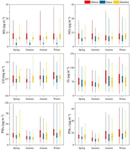 There were clear seasonal distribution characteristics of the six air contaminants in the three cities as shown in Figure 3: the highest concentration of pollutants was highest in winter, followed by autumn and spring, with the lowest in the summer. The seasonal characteristics of the pollutants in Haikou, Sanya, and Danzhou were essentially similar, with the exception of SO2 and NO2.